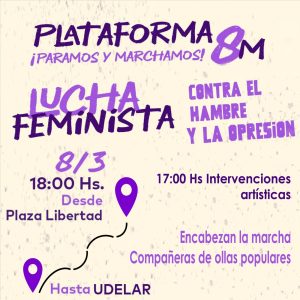 Además, adjuntamos la proclama elaborada por la Plataforma 8M «Lucha feminista contra el hambre y la opresión» Todo lo que el Estado no hace, lo hacemos las mujeres.