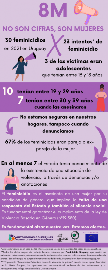 En el marco del 8 de marzo, Día internacional de las mujeres, desde el Observatorio contra la Violencia basada en Género y Acceso a la Justicia, en conjunto con el proyecto Feminicidio Uruguay, presentamos la infografía: No son cifras, son mujeres: feminicidios e intentos de feminicidios de 2021, en Uruguay.