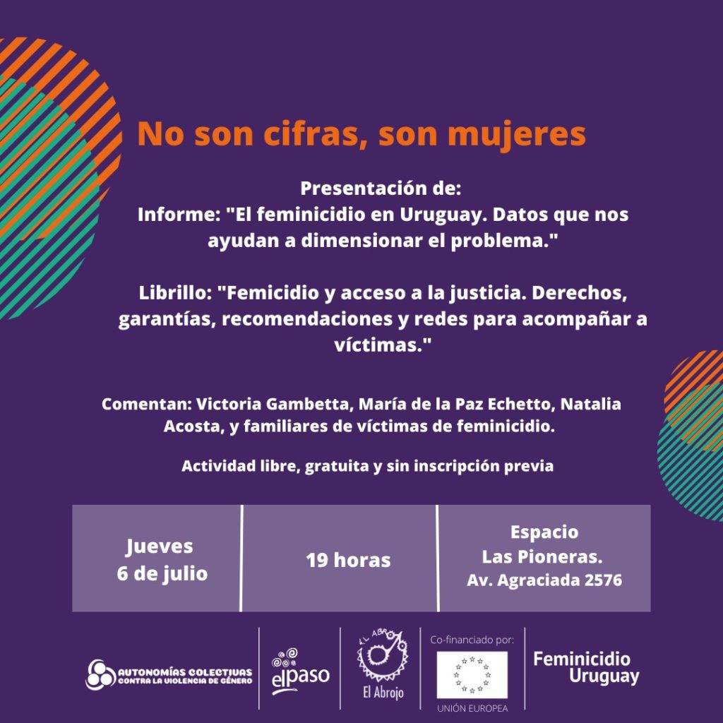 El próximo 6 de julio presentamos en Las Pioneras los documentos de Informe: «El feminicidio en Uruguay. Datos que nos ayudan a dimensionar el problema.» y el librillo «Femicidio y acceso a la justicia. Derechos, garantías, recomendaciones y redes para acompañar a víctimas.» Las esperamos a las 19 horas.